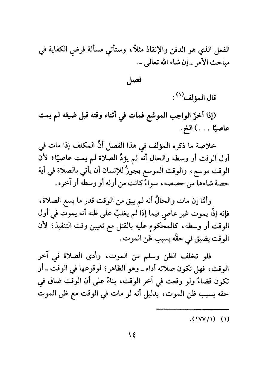 خلاصة ما ذكره المؤلف في هذا الفصل أنَّ المكلف إذا مات في أول الوقت أو وسطه والحال أنه لم يؤدِّ الصلاة لم يمت عاصيًا؛ لأن الوقت موسع، والوقت الموسع يجوزُ للإنسان أن يأتي بالصلاة في أية حصة شاءها من حصصه، سواءً كانت من أوله أو وسطه أو آخره.