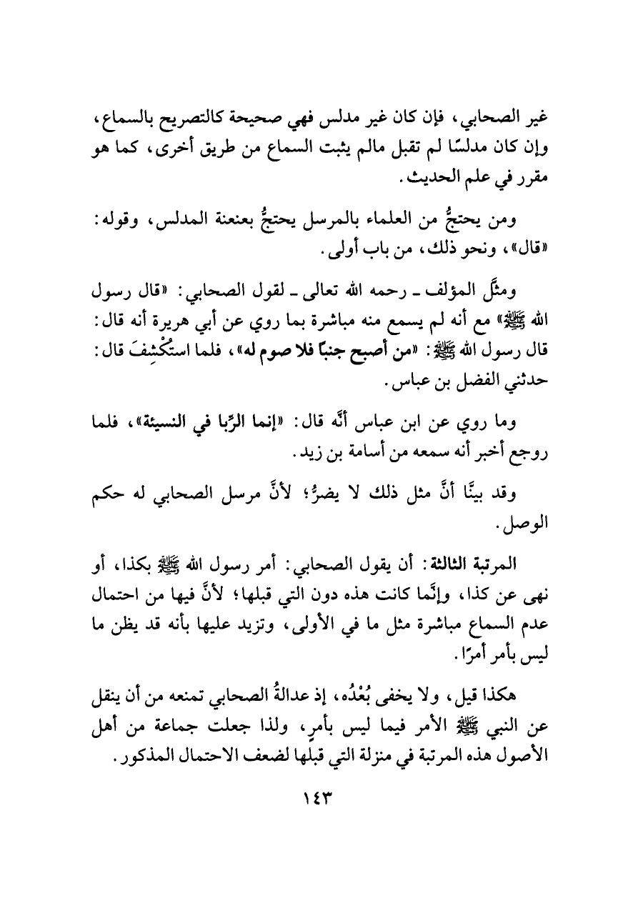 ومثَّل المؤلف -رحمه اللَّه تعالى- لقول الصحابي: "قال رسول اللَّه -صلى اللَّه عليه وسلم-" مع أنه لم يسمع منه مباشرة بما روي عن أبي هريرة أنه قال: قال رسول اللَّه -صلى اللَّه عليه وسلم-: "من أصبح جنبًا فلا صوم له"، فلما استُكْشِفَ قال: حدثني الفضل بن عباس.