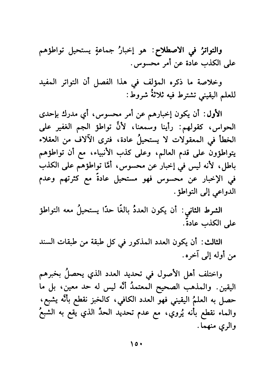 وخلاصة ما ذكره المؤلف في هذا الفصل أن التواتر المفيد للعلم اليقيني تشترط فيه ثلاثةُ شروط: