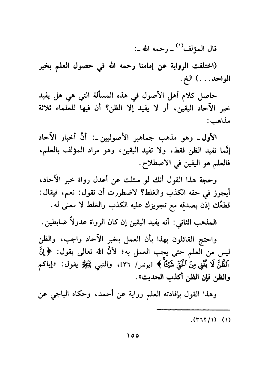 الأول -وهو مذهب جماهير الأصوليين-: أنَّ أخبار الآحاد إنَّما تفيد الظن فقط، ولا تفيد اليقين، وهو مراد المؤلف بالعلم، فالعلم هو اليقين في الاصطلاح.