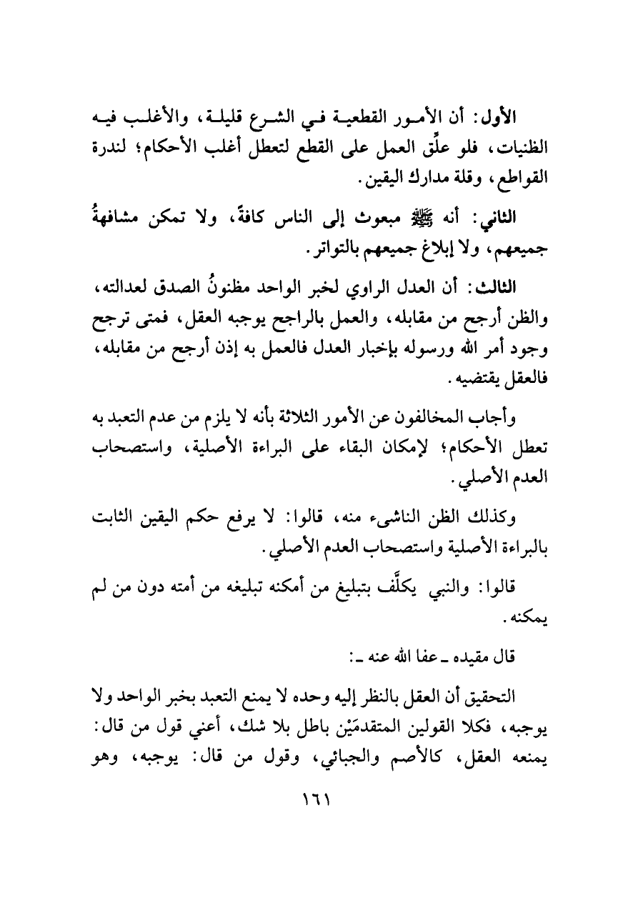 الثالث: أن العدل الراوي لخبر الواحد مظنونُ الصدق لعدالته، والظن أرجح من مقابله، والعمل بالراجح يوجبه العقل، فمتى ترجح وجود أمر اللَّه ورسوله بإخبار العدل فالعمل به إذن أرجح من مقابله، فالعقل يقتضيه.