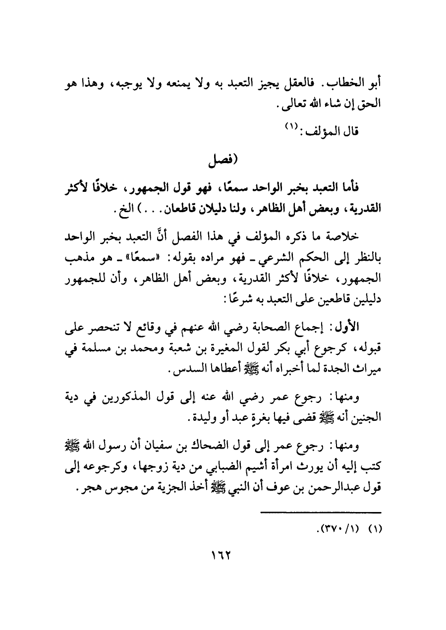 فأما التعبد بخبر الواحد سمعًا، فهو قول الجمهور، خلافًا لأكثر القدرية، وبعض أهل الظاهر، ولنا دليلان قاطعان. .) إلخ.