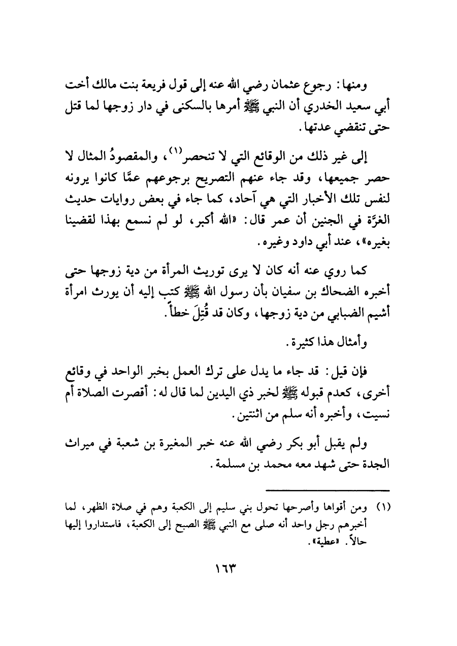 ومنها: رجوع عثمان رضي اللَّه عنه إلى قول فريعة بنت مالك أخت أبي سعيد الخدري أن النبي -صلى اللَّه عليه وسلم- أمرها بالسكنى في دار زوجها لما قتل حتى تنقضي عدتها.