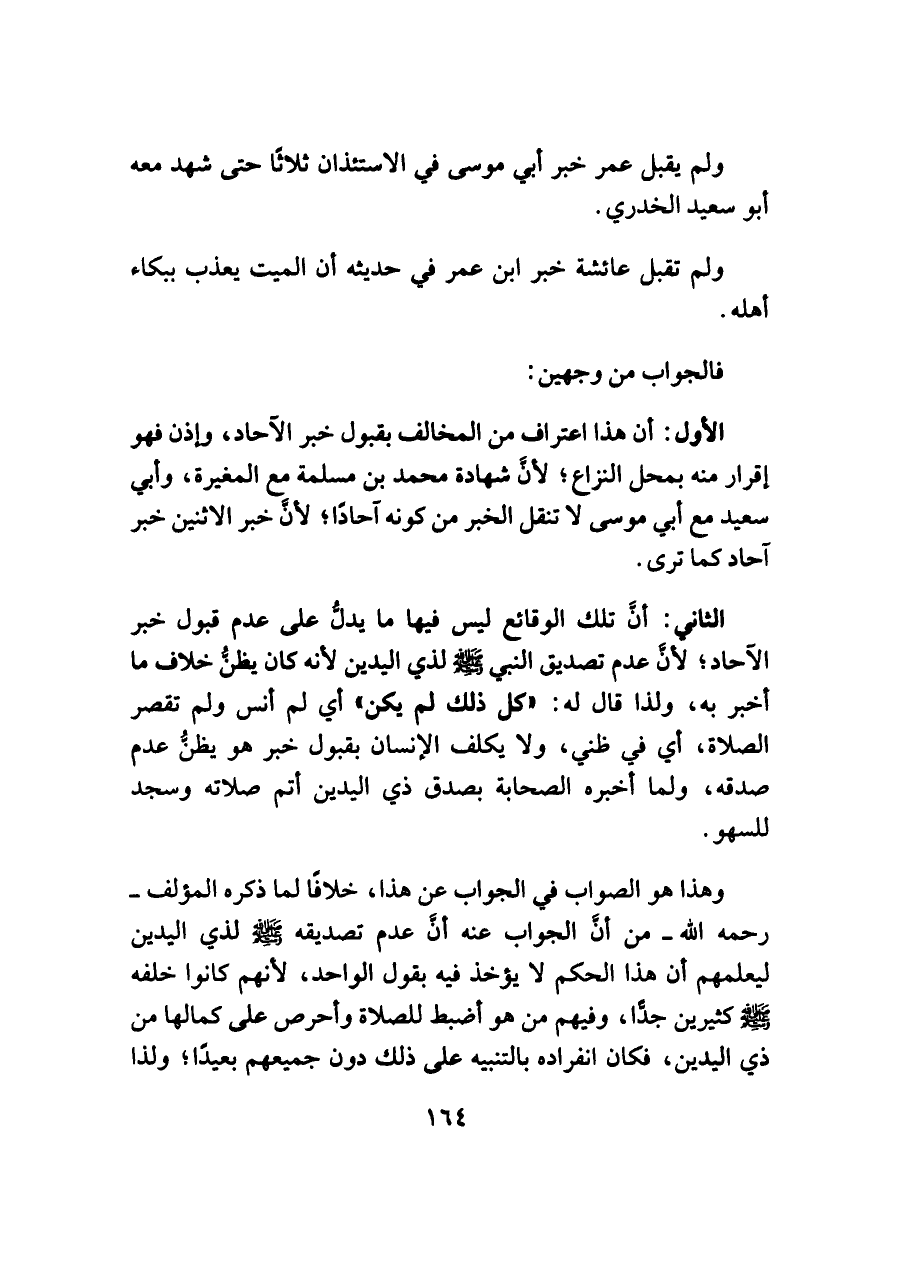 الثاني: أنَّ تلك الوقائع ليس فيها ما يدلُّ على عدم قبول خبر الآحاد؛ لأنَّ عدم تصديق النبي -صلى اللَّه عليه وسلم- لذي اليدين لأنه كان يظنُّ خلاف ما أخبر به، ولذا قال له: "كل ذلك لم يكن" أي لم أنس ولم تقصر الصلاة، أي في ظني، ولا يكلف الإنسان بقبول خبر هو يظنُّ عدم صدقه، ولما أخبره الصحابة بصدق ذي اليدين أتم صلاته وسجد للسهو.
