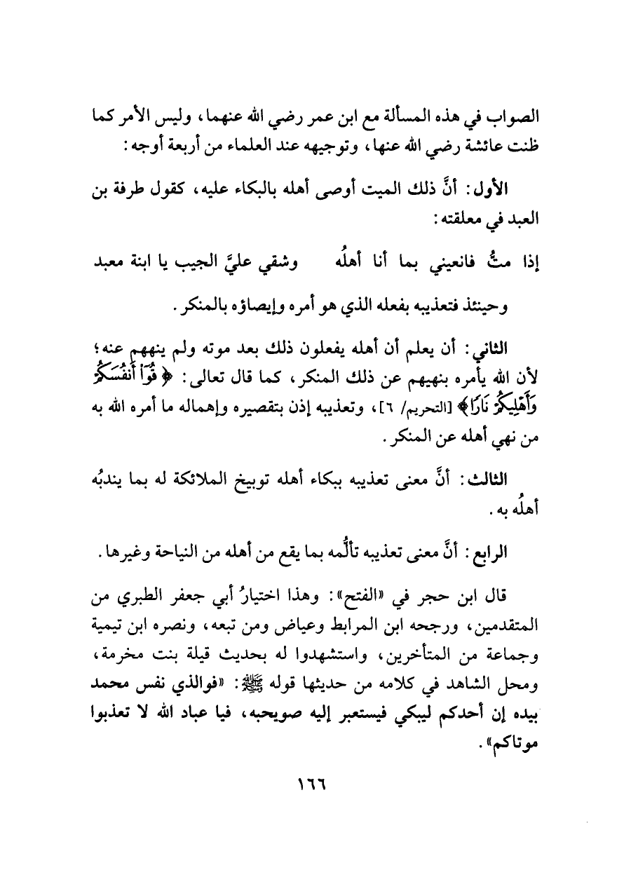 الثاني: أن يعلم أن أهله يفعلون ذلك بعد موته ولم ينههم عنه؛ لأن اللَّه فِيأمره بنهيهم عن ذلك المنكر، كما قال تعالى: {قُوا أَنْفُسَكُمْ وَأَهْلِيكُمْ نَارًا} [التحريم/ ٦]، وتعذيبه إذن بتقصيره وإهماله ما أمره اللَّه به من نهي أهله عن المنكر.