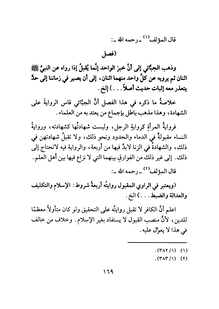 خلاصةُ ما ذكره في هذا الفصل أنَّ الجبَّائي قاس الروايةَ على الشهادة، وهذا مذهب باطل بإجماع من يعتد به من العلماء.