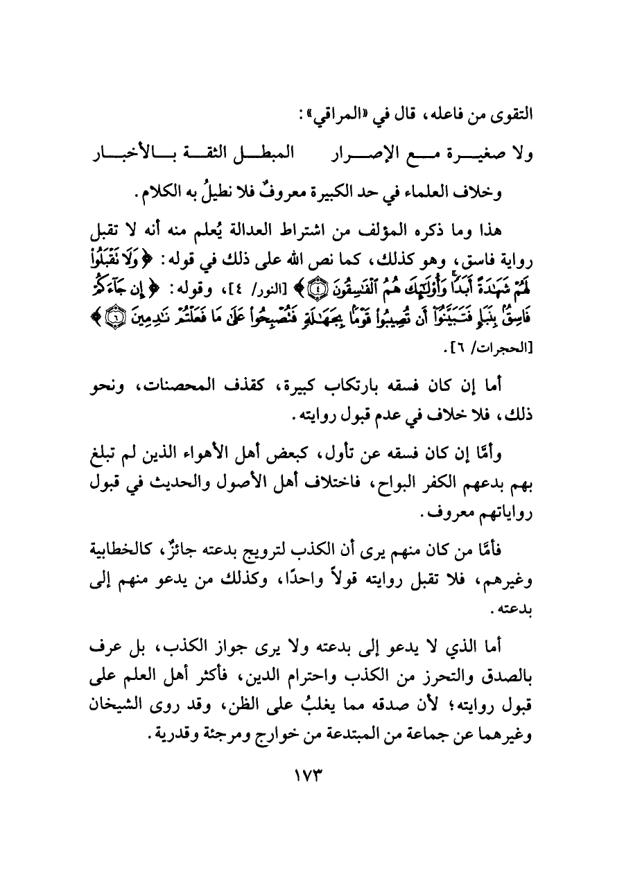 هذا وما ذكره المؤلف من اشتراط العدالة يُعلم منه أنه لا تقبل رواية فاسق، وهو كذلك، كما نص اللَّه على ذلك في قوله: {وَلَا تَقْبَلُوا لَهُمْ شَهَادَةً أَبَدًا وَأُولَئِكَ هُمُ الْفَاسِقُونَ (٤)} [النور/ ٤]، وقوله: {إِنْ جَاءَكُمْ فَاسِقٌ بِنَبَإٍ فَتَبَيَّنُوا أَنْ تُصِيبُوا قَوْمًا بِجَهَالَةٍ فَتُصْبِحُوا عَلَى مَا فَعَلْتُمْ نَادِمِينَ (٦)} [الحجرات/ ٦].