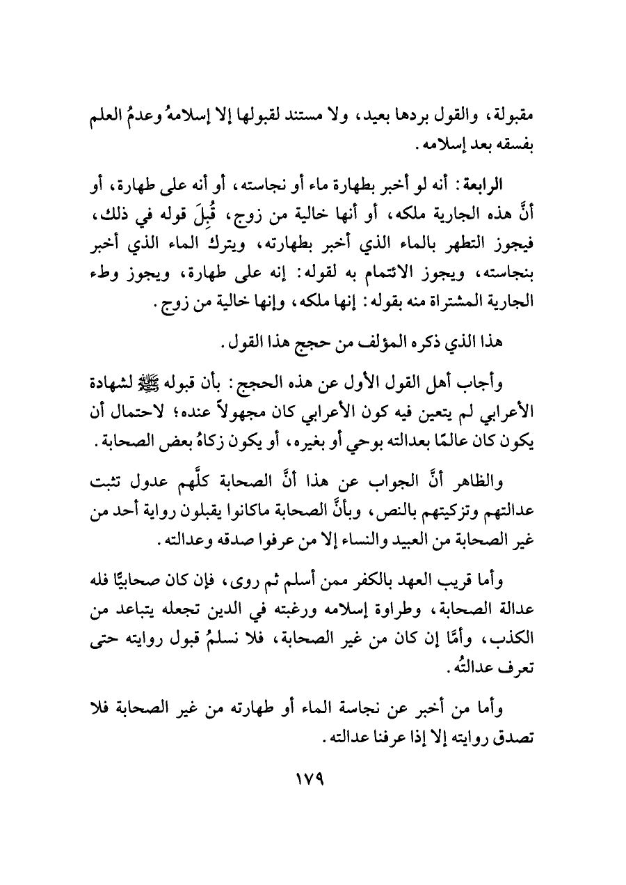 وأما من أخبر عن نجاسة الماء أو طهارته من غير الصحابة فلا تصدق روايته إلا إذا عرفنا عدالته.