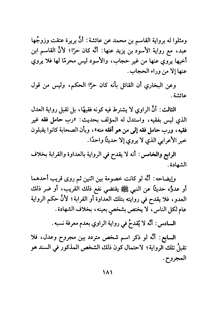 الثالث: أنَّ الراوي لا يشترط فيه كونه فقيهًا، بل تقبل رواية العدل الذي ليس بفقيه، واستدل له المؤلف بحديث: "رب حامل فقه غير فقيه، ورب حامل فقه إلى من هو أفقه منه"، وبأن الصحابة كانوا يقبلون خبر الأعرابي الذي لا يروي إلا حديثًا واحدًا.