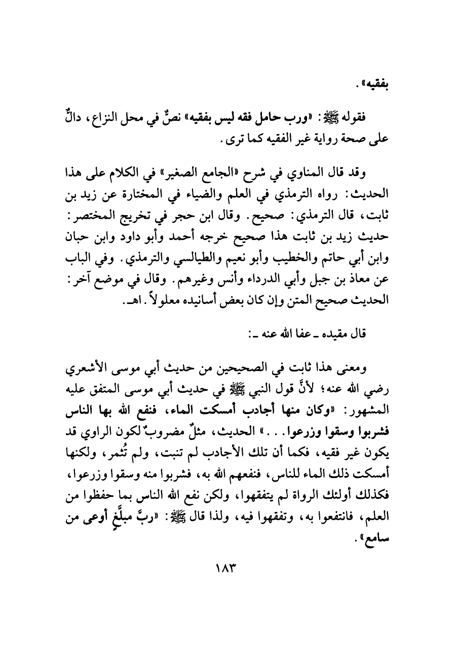 ومعنى هذا ثابت في الصحيحين من حديث أبي موسى الأشعري رضي اللَّه عنه؛ لأنَّ قول النبي -صلى اللَّه عليه وسلم- في حديث أبي موسى المتفق عليه المشهور: "وكان منها أجادب أمسكت الماء، فنفع اللَّه بها الناس فشربوا وسقوا وزرعوا. . ." الحديث، مثلٌ مضروبٌ لكون الراوي قد يكون غير فقيه، فكما أن تلك الأجادب لم تنبت، ولم تُثمر، ولكنها أمسكت ذلك الماء للناس، فنفعهم اللَّه به، فشربوا منه وسقوا وزرعوا، فكذلك أولئك الرواة لم يتفقهوا، ولكن نفع اللَّه الناس بما حفظوا من العلم، فانتفعوا به، وتفقهوا فيه، ولذا قال -صلى اللَّه عليه وسلم-: "ربَّ مبلَّغٍ أوعى من سامع".