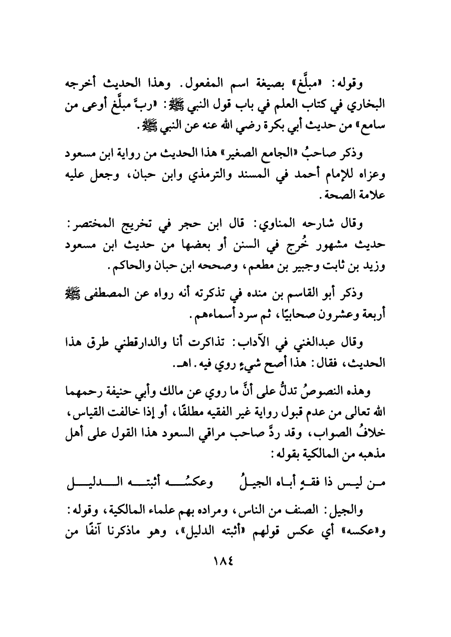 وهذه النصوصُ تدلُّ على أنَّ ما روي عن مالك وأبي حنيفة رحمهما اللَّه تعالى من عدم قبول رواية غير الفقيه مطلقًا، أو إذا خالفت القياس، خلافُ الصواب، وقد ردَّ صاحب مراقي السعود هذا القول على أهل مذهبه من المالكية بقوله: