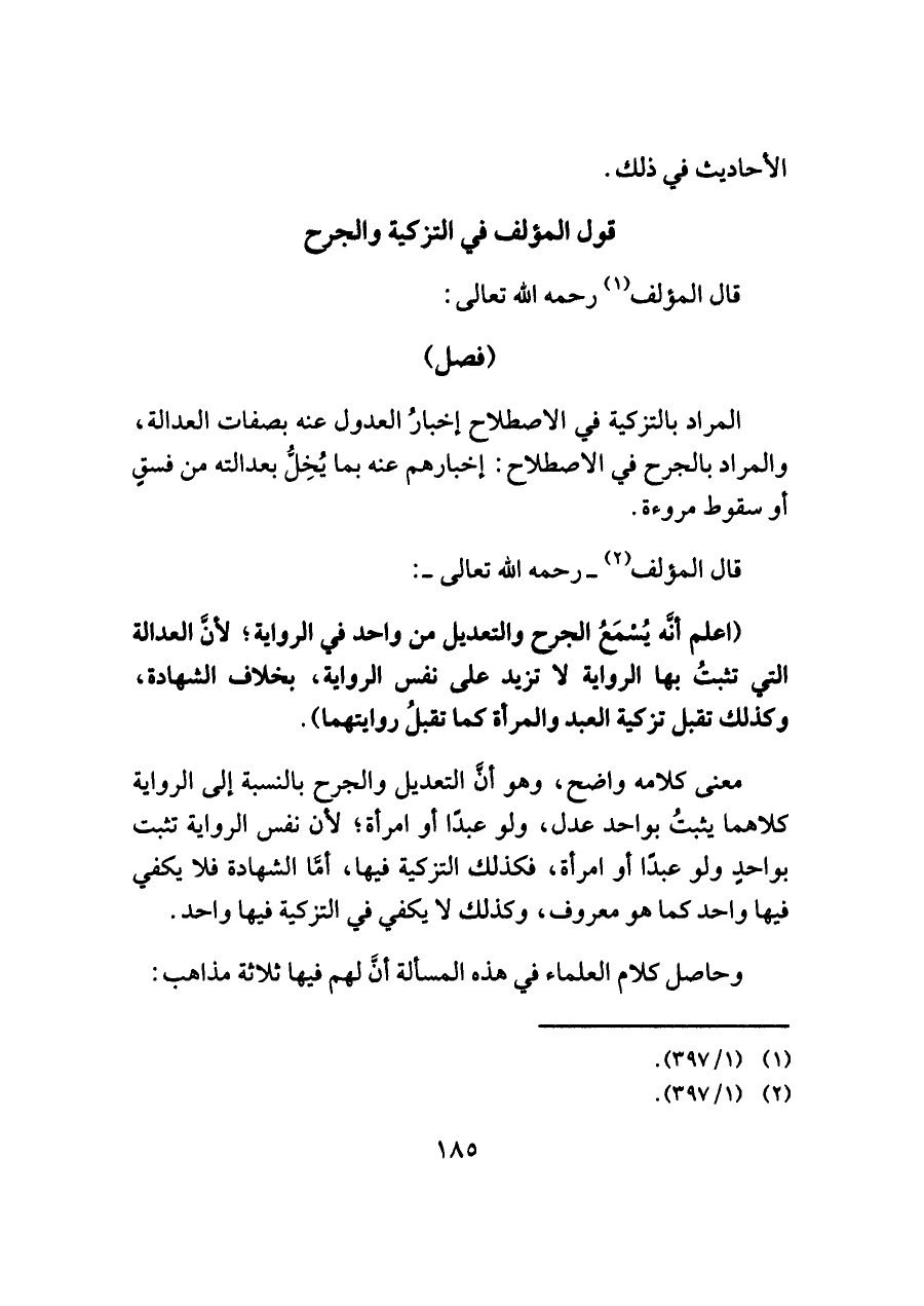 معنى كلامه واضح، وهو أن التعديل والجرح بالنسبة إلى الرواية كلاهما يثبتُ بواحد عدل، ولو عبدًا أو امرأة؛ لأن نفس الرواية تثبت بواحدٍ ولو عبدًا أو امرأة، فكذلك التزكية فيها، أمَّا الشهادة فلا يكفي فيها واحد كما هو معروف، وكذلك لا يكفي في التزكية فيها واحد.