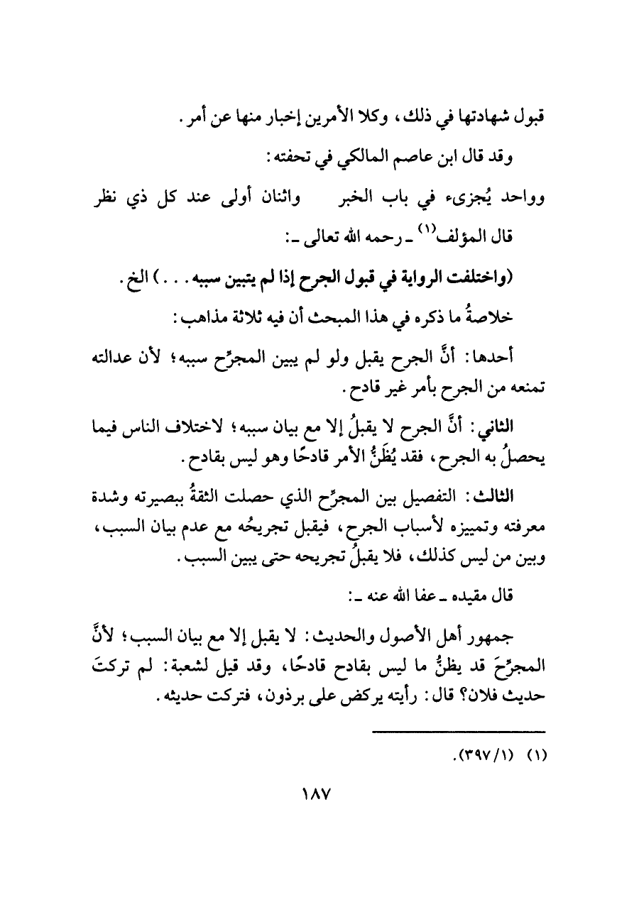 الثاني: أنَّ الجرح لا يقبلُ إلا مع بيان سببه؛ لاختلاف الناس فيما يحصلُ به الجرح، فقد يُظَنُّ الأمر قادحًا وهو ليس بقادح.