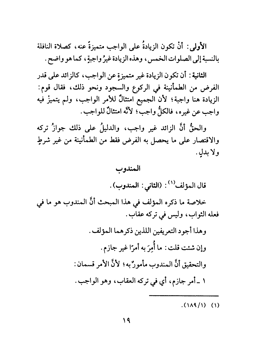 خلاصة ما ذكره المؤلف في هذا المبحث أنَّ المندوب هو ما في فعله الثواب، وليس في تركه عقاب.