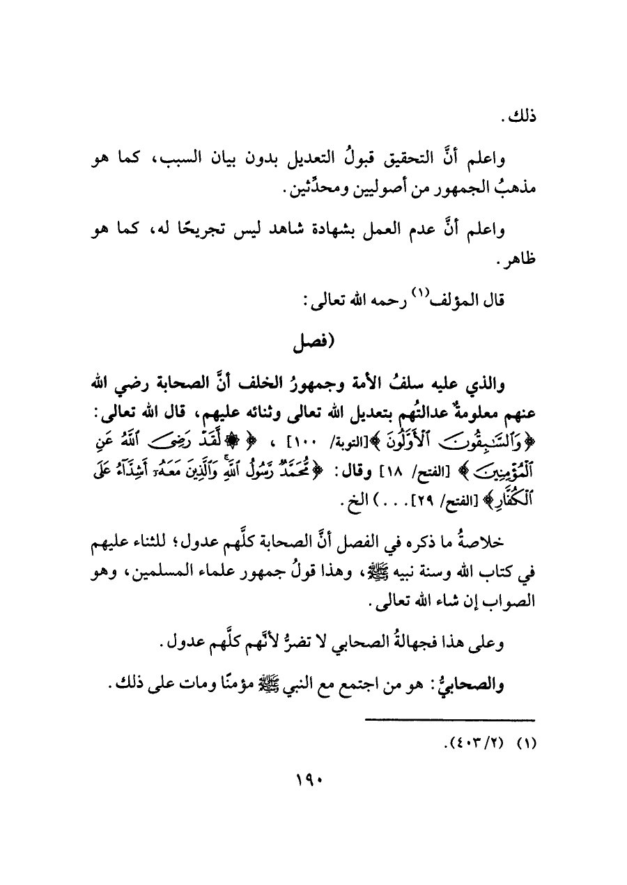 والذي عليه سلفُ الأمة وجمهورُ الخلف أنَّ الصحابة رضي اللَّه عنهم معلومةٌ عدالتُهم بتعديل اللَّه تعالى وثنائه عليهم، قال اللَّه تعالى: {وَالسَّابِقُونَ الْأَوَّلُونَ} [التوبة/ ١٠٠]، {لَقَدْ رَضِيَ اللَّهُ عَنِ الْمُؤْمِنِينَ} [الفتح/ ١٨] وقال: {مُحَمَّدٌ رَسُولُ اللَّهِ وَالَّذِينَ مَعَهُ أَشِدَّاءُ عَلَى الْكُفَّارِ} [الفتح/ ٢٩]. .) الخ.