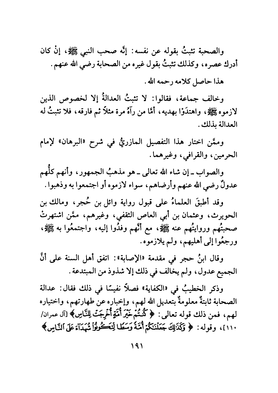 وخالف جماعة، فقالوا: لا تثبتُ العدالةُ إلا لخصوص الذين لازموه -صلى اللَّه عليه وسلم-، واهتدَوْا بهديه، أمَّا من رآهُ مرة مثلًا ثم فارقه، فلا تثبتُ له العدالة بذلك.