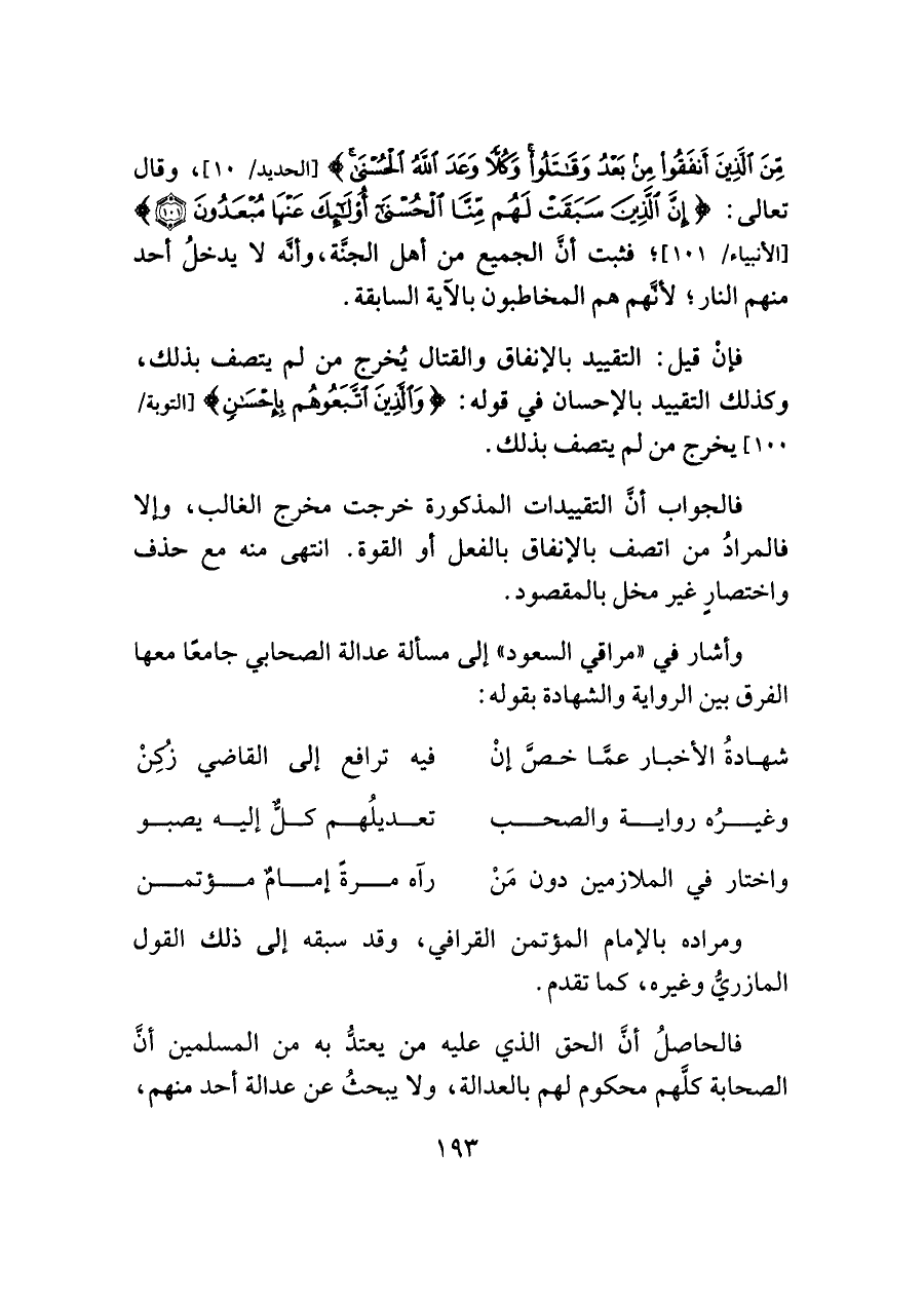 مِنَ الَّذِينَ أَنْفَقُوا مِنْ بَعْدُ وَقَاتَلُوا وَكُلًّا وَعَدَ اللَّهُ الْحُسْنَى} [الحديد/ ١٠]، وقال تعالى: {إِنَّ الَّذِينَ سَبَقَتْ لَهُمْ مِنَّا الْحُسْنَى أُولَئِكَ عَنْهَا مُبْعَدُونَ (١٠١)} [الأنبياء/ ١٠١]؛ فثبت أنَّ الجميع من أهل الجنَّة، وأنَّه لا يدخلُ أحد منهم النار؛ لأنَّهم هم المخاطبون بالآية السابقة.