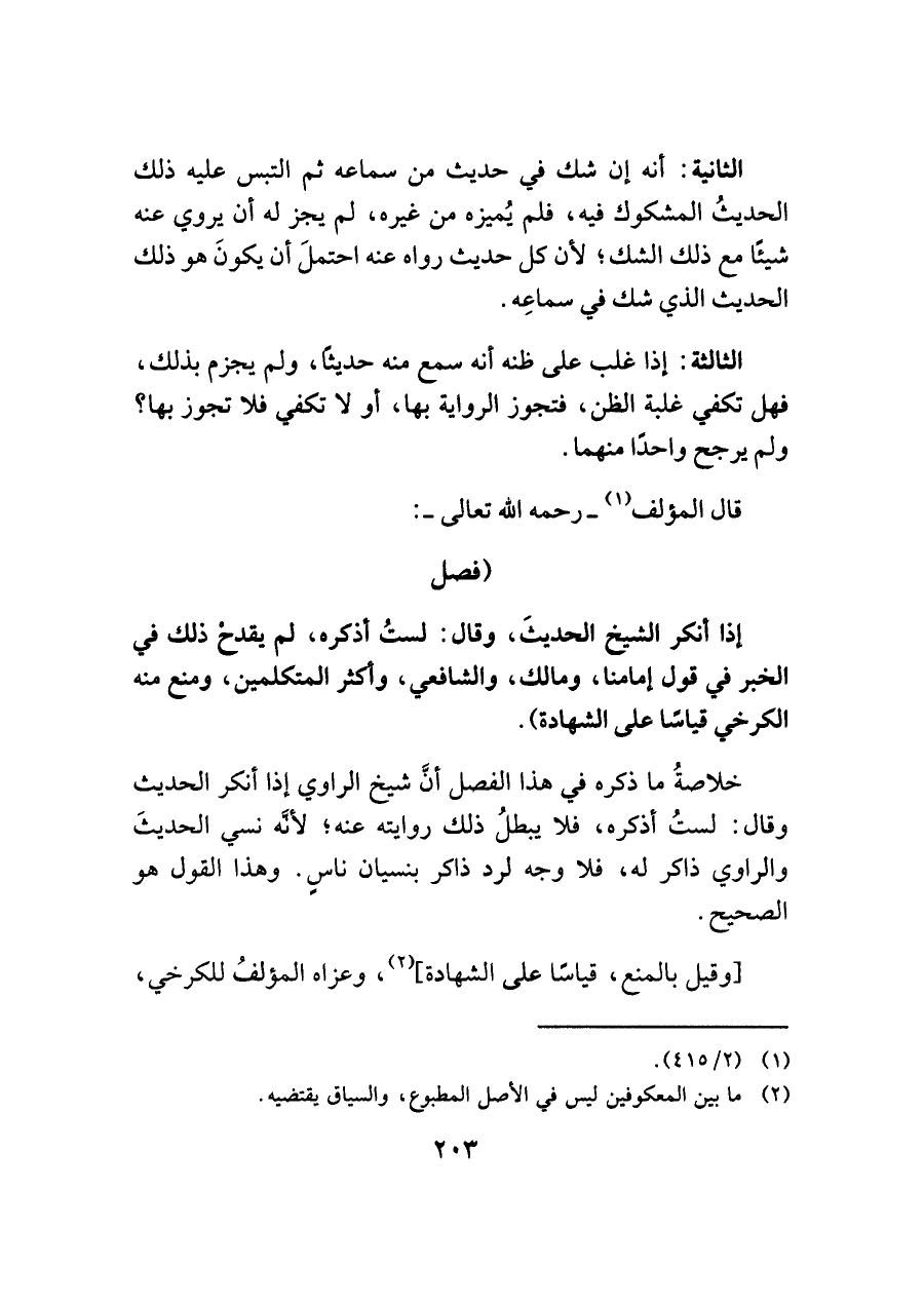 إذا أنكر الشيخ الحديثَ، وقال: لستُ أذكره، لم يقدح ذلك في الخبر في قول إمامنا، ومالك، والشافعي، وأكثر المتكلمين، ومنع منه الكرخي قياسًا على الشهادة).