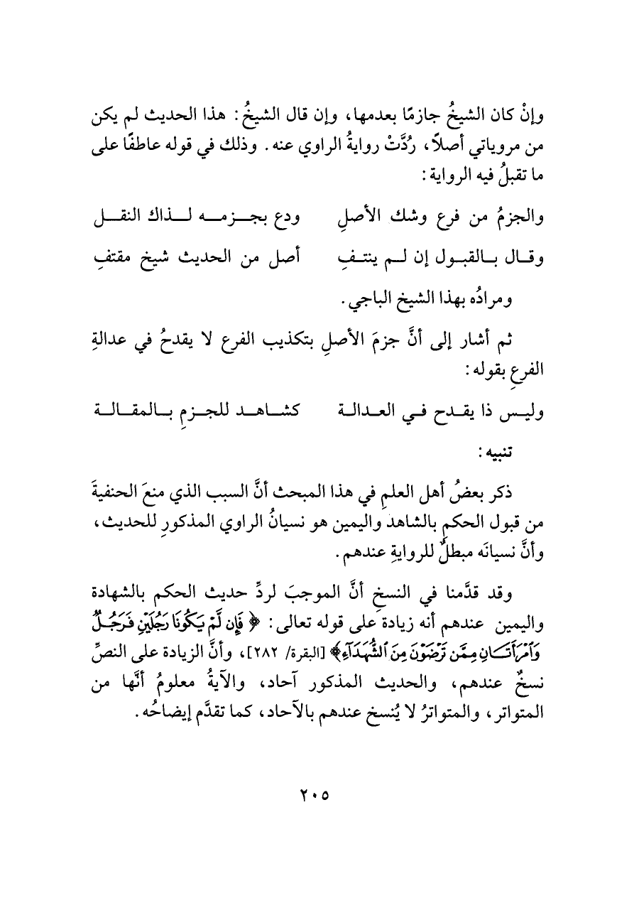 وقد قدَّمنا في النسخِ أن الموجبَ لردِّ حديث الحكم بالشهادة واليمين عندهم أنَّه زيادة على قوله تعالى: {لَمْ يَكُونَا رَجُلَيْنِ فَرَجُلٌ وَامْرَأَتَانِ مِمَّنْ تَرْضَوْنَ مِنَ الشُّهَدَاءِ} [البقرة/ ٢٨٢]، وأنَّ الزيادة على النصِّ نسخ عندهم، والحديث المذكور آحاد، والآيةُ معلومُ أنَّها من المتواتر، والمتواترُ لا يُنسخ عندهم بالآحاد، كما تقدَّم إيضاحُه.