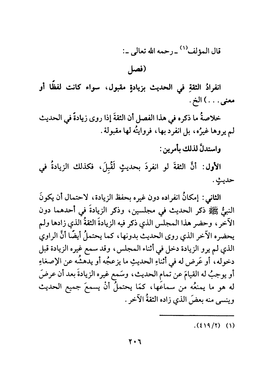 انفرادُ الثقةِ في الحديث بزيادةٍ مقبول، سواء كانت لفظًا أو معنى. . .) الخ.