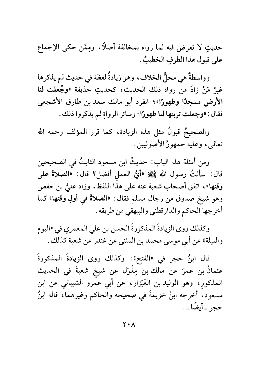 وواسطةٌ هي محلُّ الخلاف، وهو زيادةُ لفظة في حديث لم يذكرها غيرُ مَنْ زادَ من رواة ذلك الحديث، كحديثِ حذيفة "وجُعلت لنا الأرض مسجدًا وطهورًا"؛ انفرد أَبو مالك سعد بن طارق الأشجعي فقال: "وجعلت تربتها لنا طهورًا" وسائر الرواةِ لم يذكروا ذلك.