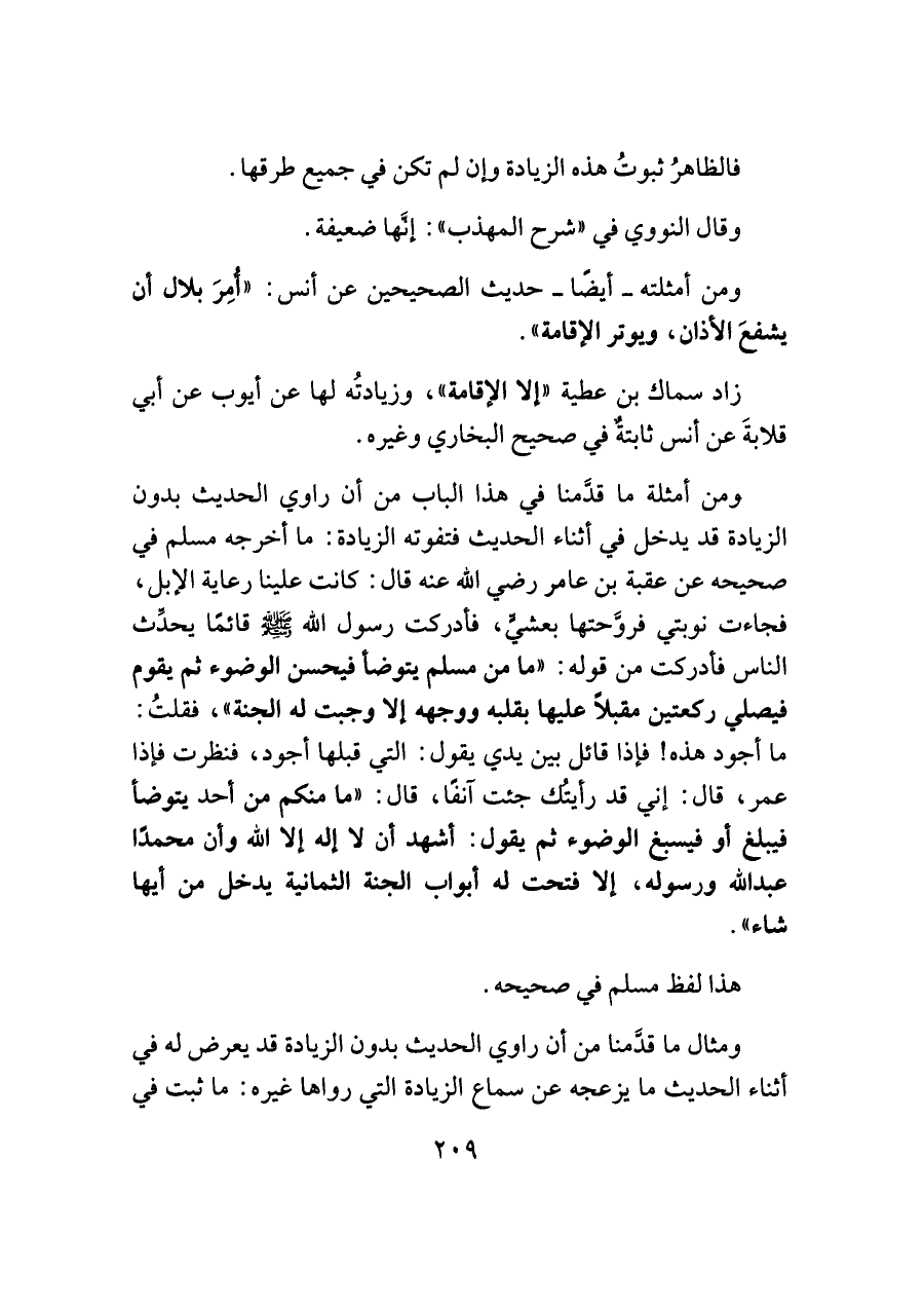 ومن أمثلة ما قدَّمنا في هذا الباب من أن راوي الحديث بدون الزيادة قد يدخل في أثناء الحديث فتفوته الزيادة: ما أخرجه مسلم في صحيحه عن عقبة بنُ عامر رضي اللَّه عنه قال: كانت علينا رعاية الإبل، فجاءت نوبتي فروَّحتها بعشيٍّ، فأدركت رسول اللَّه -صلى اللَّه عليه وسلم- قائمًا يحدِّث الناس فأدركت من قوله: "ما من مسلم يتوضأ فيحسن الوضوء ثم يقوم فيصلي ركعتين مقبلًا عليها بقلبه ووجهه إلَّا وجبت له الجنَّةَ"، فقلتُ: ما أجود هذه! فإذا قائل بين يدي يقول: التي قبلها أجود، فنظرت فإذا عمر، قال: إني قد رأيتُك جئت آنفًا، قال: "ما منكم من أحد يتوضأ فيبلغ أو فيسبغ الوضوء ثم يقول: أشهد أن لا إله إلَّا اللَّه وأن محمدًا عبد اللَّه ورسوله، إلَّا فتحت له أَبواب الجنَّةَ الثمانية يدخل من أيها شاء".