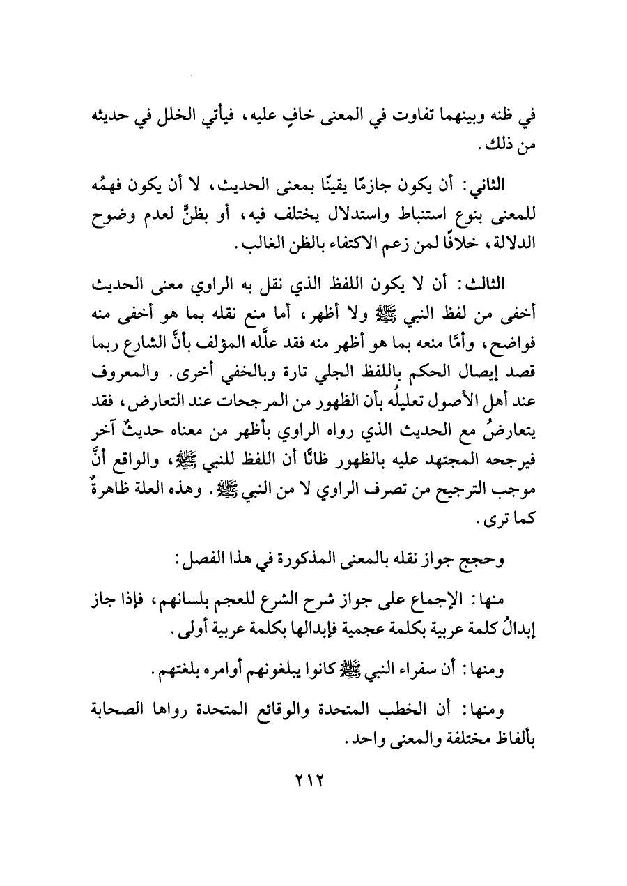 الثالث: أن لا يكون اللفظ الذي نقل به الراوي معنى الحديث أخفى من لفظ النبي -صلى اللَّه عليه وسلم- ولا أظهر، أما منع نقله بما هو أخفى منه فواضح، وأمَّا منعه بما هو أظهر منه فقد علَّله المؤلف بأنَّ الشارع ربما قصد إيصال الحكم باللفظ الجلي تارة وبالخفي أخرى. والمعروف عند أهل الأصول تعليلُه بأن الظهور من المرجحات عند التعارض، فقد يتعارضُ مع الحديث الذي رواه الراوي بأظهر من معناه حديثٌ آخر فيرجحه المجتهد عليه بالظهور ظانًّا أن اللفظ للنبي -صلى اللَّه عليه وسلم- والواقع أنَّ موجب الترجيح من تصرف الراوي لا من النبي -صلى اللَّه عليه وسلم-. وهذه العلة ظاهرةٌ كما ترى.