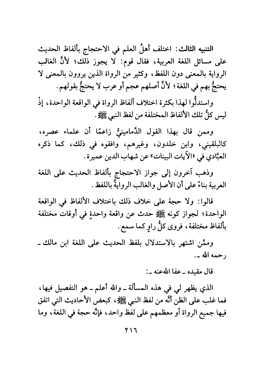 التنبيه الثالث: اختلف أهلُ العلم في الاحتجاج بألفاظ الحديث على مسائل اللغة العربية، فقال قوم: لا يجوز ذلك؛ لأنَّ الغالب الرواية بالمعنى دون اللفظ، وكثير من الرواة الذين يروون بالمعنى لا يحتجُّ بهم في اللغة؛ لأنَّ أصلهم عجم أو عرب لا يحتجُّ بقولهم.