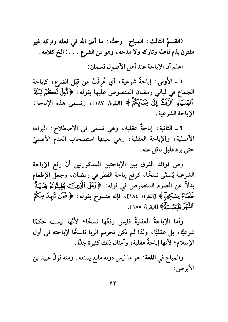 ١ - الأولى: إباحةٌ شرعية، أي عُرِفَتْ من قِبَل الشرع، كإباحة الجماع في ليالي رمضان المنصوص عليها بقوله: {أُحِلَّ لَكُمْ لَيْلَةَ الصِّيَامِ الرَّفَثُ إِلَى نِسَائِكُمْ} [البقرة/ ١٨٧]، وتسمى هذه الإباحة: الإباحة الشرعية.