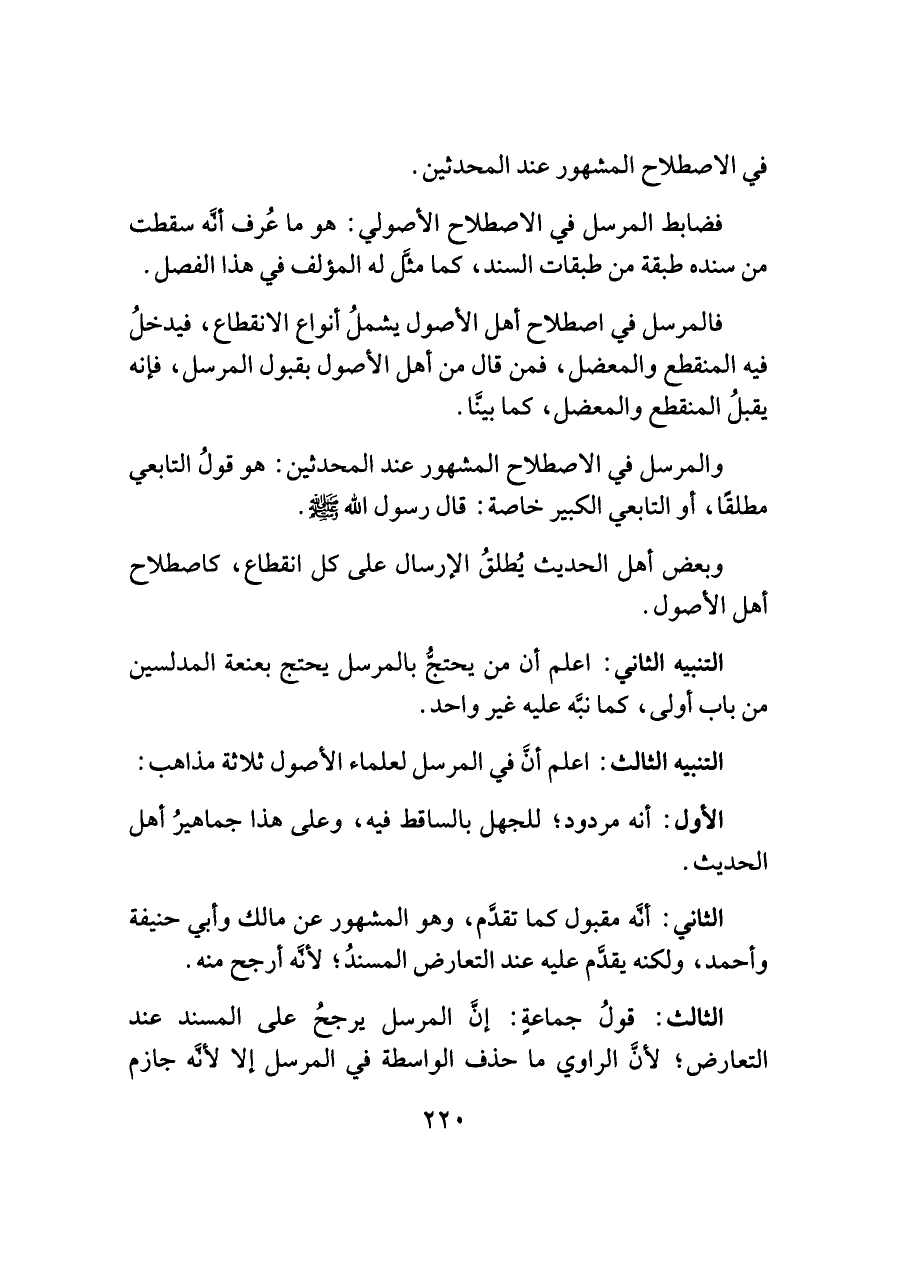 التنبيه الثالث: اعلم أن في المرسل لعلماء الأصول ثلاثة مذاهب:
