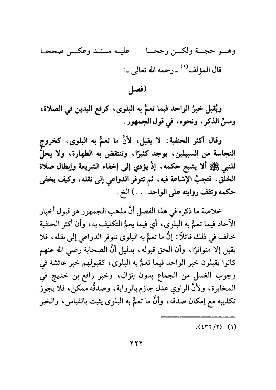 وقال أكثر الحنفية: لا يقبل، لأنَّ ما تعمُّ به البلوى، كخروج النجاسة من السبيلين، يوجد كثيرًا، وتنتقض به الطهارة، ولا يحلُّ للنبي -صلى اللَّه عليه وسلم- ألا يشيع حكمه، إذْ يؤدي إلى إخفاء الشريعة وإبطال صلاة الخلق، فتجبُ الإشاعة فيه، ثم تتوفر الدواير إلى نقله، وكيف يخفى حكمه وتقف روايته على الواحد. . .) الخ.