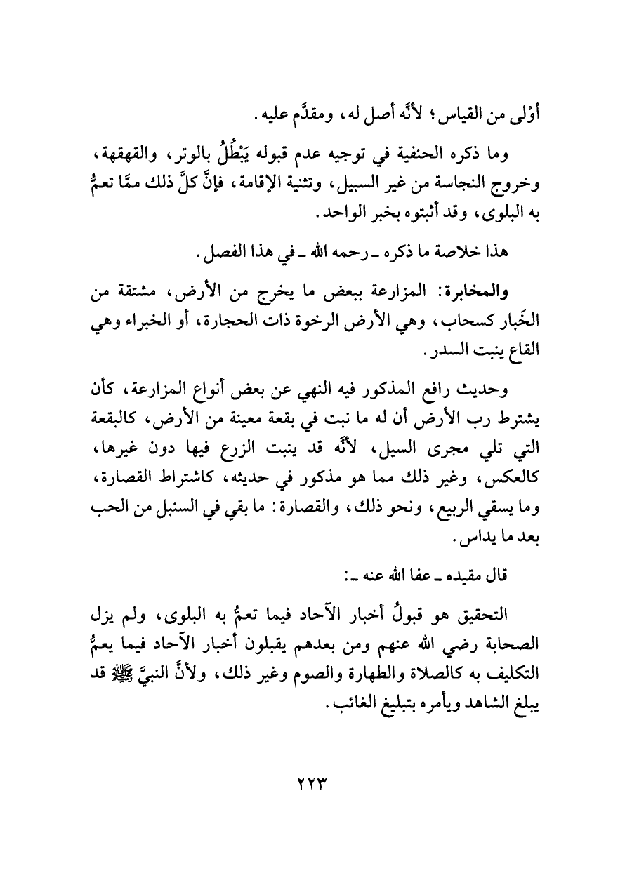 التحقيق هو قبولُ أخبار الآحاد فيما تعمُّ به البلوى، ولم يزل الصحابة رضي اللَّه عنهم ومن بعدهم يقبلون أخبار الآحاد فيما يعمُّ التكليف به كالصلاة والطهارة والصوم وغير ذلك، ولأنَّ النبيَّ -صلى اللَّه عليه وسلم- قد يبلغ الشاهد ويأمره بتبليغ الغائب.