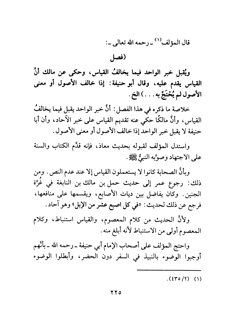 ويُقبل خبر الواحد فيما يخالفُ القياس، وحكى عن مالك أنَّ القياس يقدم عليه، وقال أَبو حنيفة: إذا خالف الأصول أو معنى الأصول لم يُحْتَجَّ به. . .) الخ.