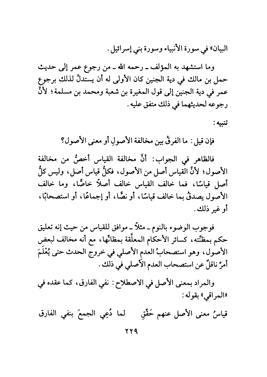 فوجوب الوضوء بالنوم -مثلًا- موافق للقياس من حيث إنه تعليق حكم بمظنَّته، كسائر الأحكام المعلَّقة بمظانِّها، مع أنَّه مخالف لبعض الأصول، وهو استصحابُ العدمِ الأصلي في خروج الحدث حتى يُعْلَمَ أمرٌ ناقلٌ عن استصحاب العدم الأصلي في ذلك.