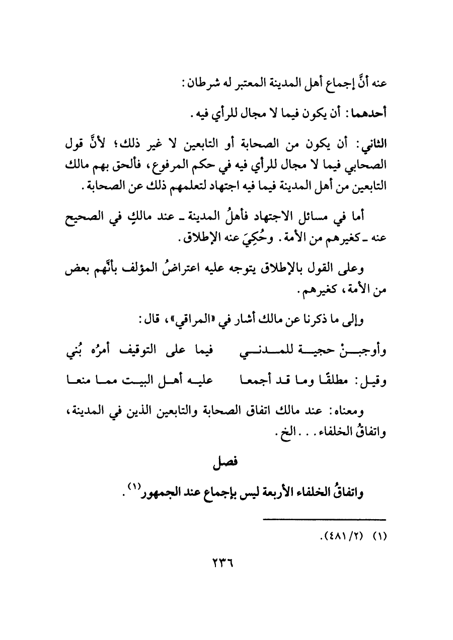 عنه أنَّ إجماع أهل المدينة المعتبر له شرطان: