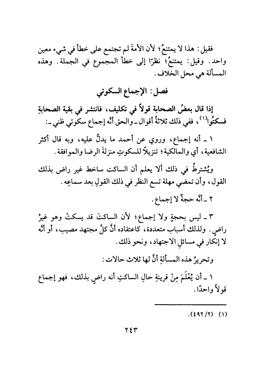 ٣ - ليس بحجةٍ ولا إجماع؛ لأن الساكتَ قد يسكتْ وهو غيرُ راضٍ. ولذلك أسباب متعددة، كاعتقاده أن كلَّ مجتهد مصيب، أو أنَّه لا إنكار في مسائلِ الاجتهاد، ونحو ذلك.