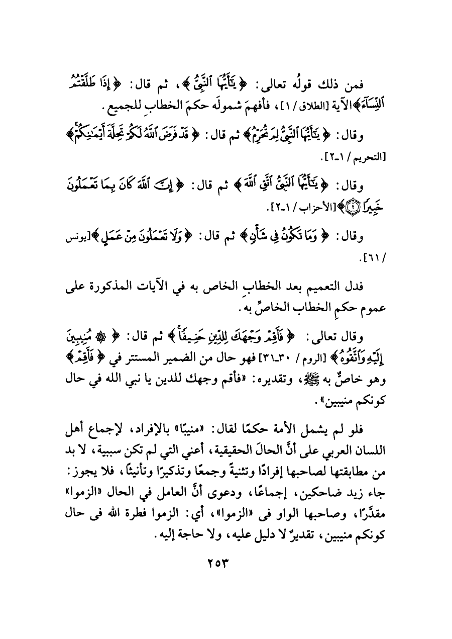 فلو لم يشمل الأمة حكمًا لقال: "منيبًا" بالإفراد، لإجماع أهل اللسان العربي على أنَّ الحالَ الحقيقية، أعني التي لم تكن سببية، لا بد من مطابقتها لصاحبها إفرادًا وتثنيةً وجمعًا وتذكيرًا وتأنيثًا، فلا يجوز: جاء زيد ضاحكين، إجماعًا، ودعوى أنَّ العامل في الحال "الزموا" مقدَّرًا، وصاحبها الواو فى "الزموا"، أي: الزموا فطرة اللَّه فى حال كونكم منيبين، تقديرٌ لا دليل عليه، ولا حاجة إليه.