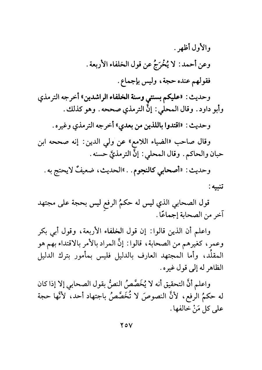 واعلم أن الذين قالوا: إن قول الخلفاء الأربعة، وقول أبي بكر وعمر، كغيرهم من الصحابة، قالوا: إنَّ المراد بالأمر بالاقتداء بهم هو المقلِّد، وأما المجتهد العارف بالدليل فليس بمأمور بترك الدليل الظاهر له إلى قول غيره.