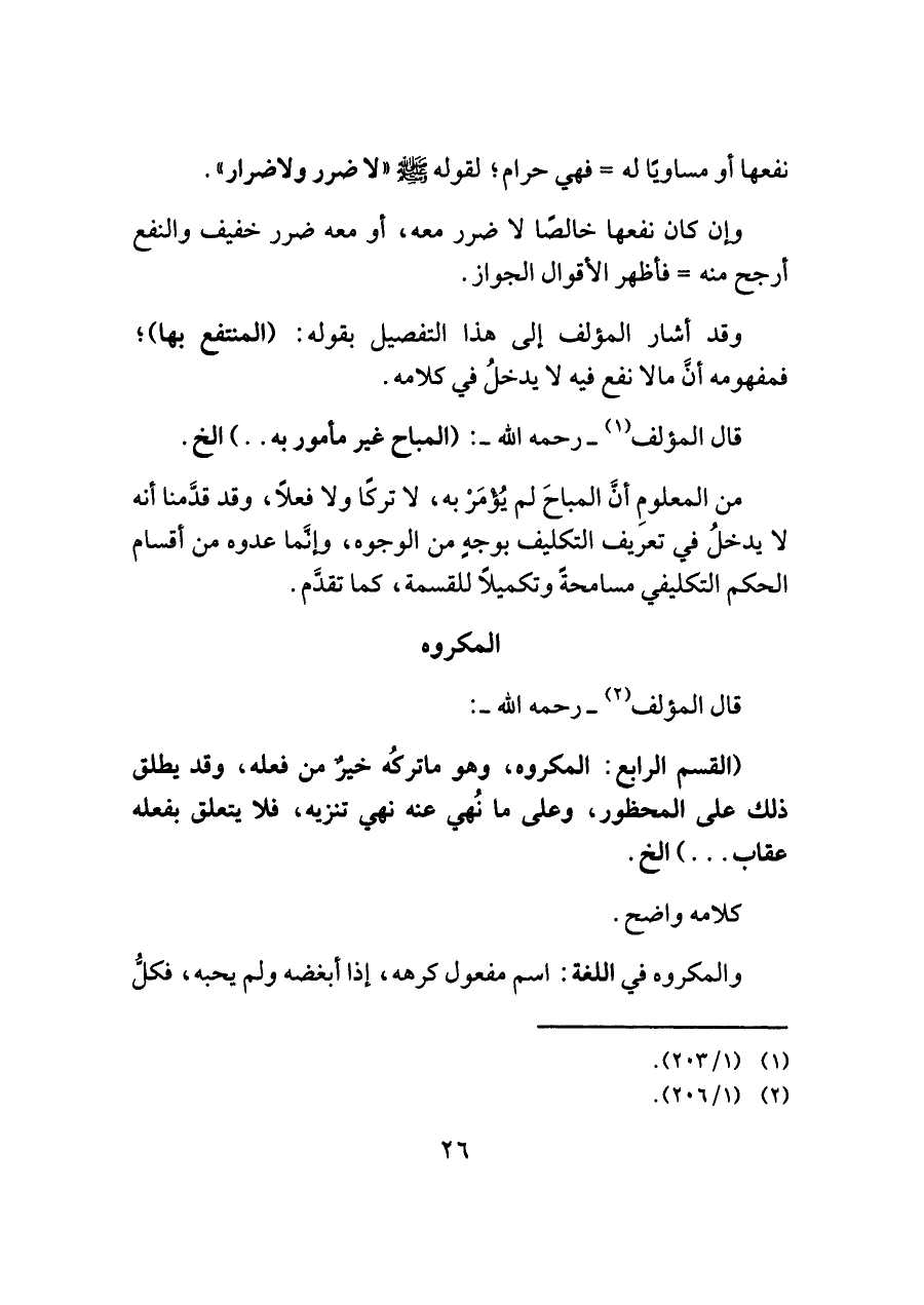 (القسم الرابع: المكروه، وهو ما تركُه خيرٌ من فعله، وقد يطلق ذلك على المحظور، وعلى ما نُهي عنه نهي تنزيه، فلا يتعلق بفعله عقاب. . .) الخ.
