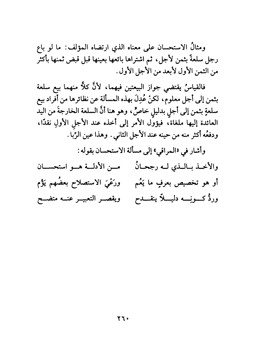 ومثالُ الاستحسان على معناه الذي ارتضاه المؤلف: ما لو باع رجل سلعةً بثمن لأجل، ثم اشتراها بائعها بعينها قبل قبض ثمنها بأكثر من الثمن الأول لأبعد من الأجل الأول.