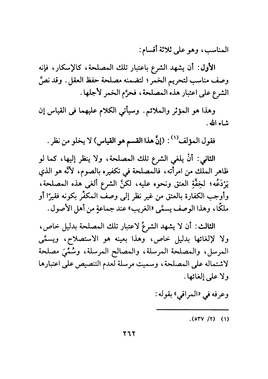 الثاني: أنْ يلغي الشرع تلك المصلحة، ولا ينظر إليها، كما لو ظاهر الملك من امرأته، فالمصلحة في تكفيره بالصوم، لأنَّه هو الذي يَرْدَعُه؛ لخِفَّةِ العتق ونحوه عليه، لكنَّ الشرع ألغى هذه المصلحة، وأوجب الكفارة بالعتق من غير نظر إلى وصف المكفِّر بكونه فقيرًا أو ملكًا، وهذا الوصف يسمَّى "الغريب" عند جماعةٍ من أهل الأصول.
