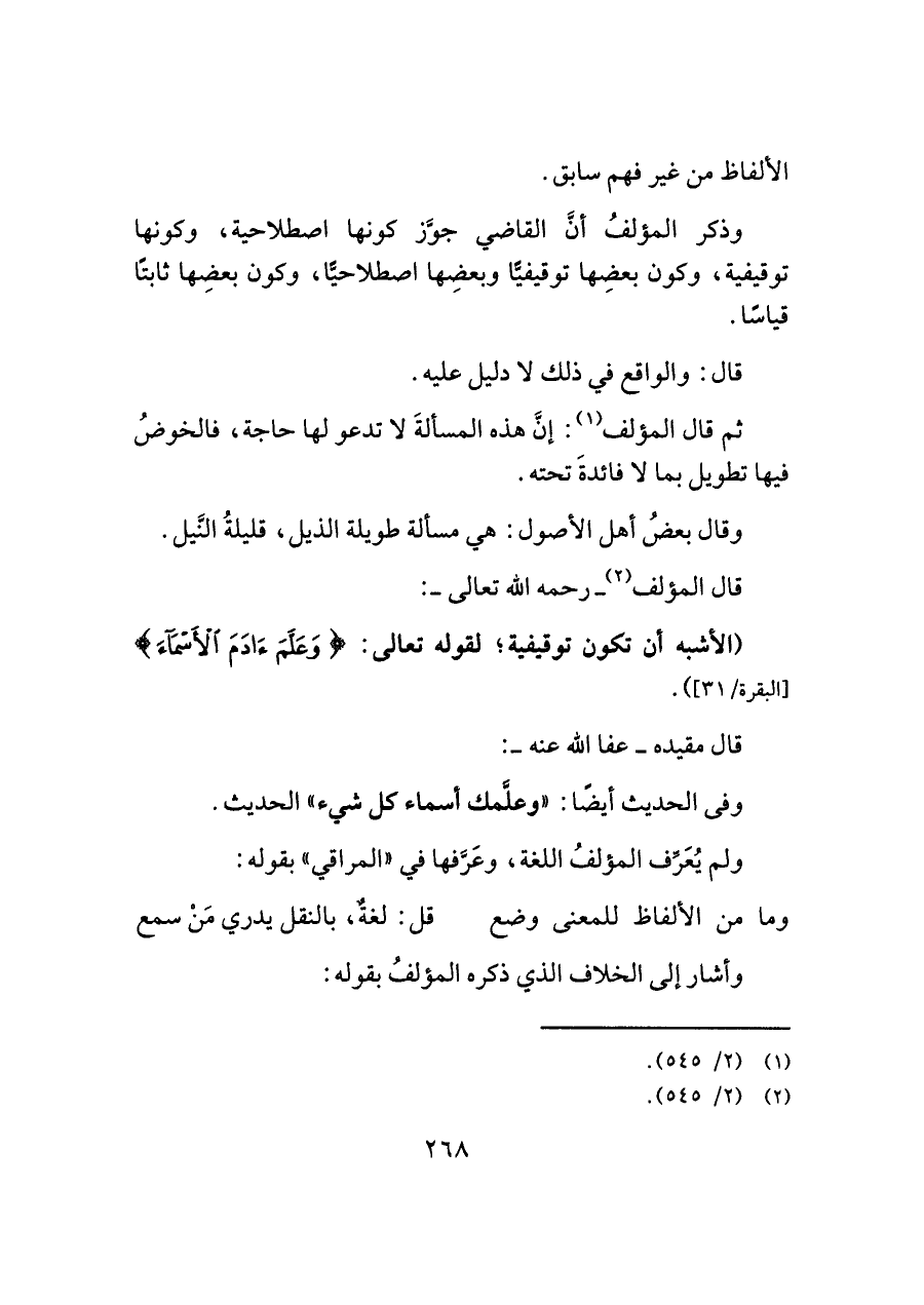 وذكر المؤلفُ أنَّ القاضي جوَّز كونها اصطلاحية، وكونها توقيفية، وكون بعضِها توقيفيًّا وبعضِها اصطلاحيًّا، وكون بعضِها ثابتًا قياسًا.