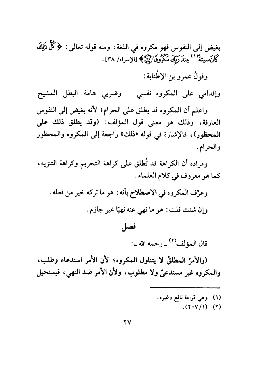 واعلم أن المكروه قد يطلق على الحرام؛ لأنه بغيض إلى النفوس العارفة، وذلك هو معنى قول المؤلف: (وقد يطلق ذلك على المحظور)، فالإشارة في قوله "ذلك" راجعة إلى المكروه والمحظور والحرام.