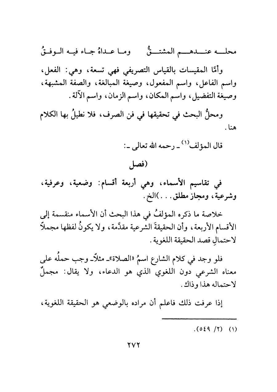 في تقاسيم الأسماء، وهي أربعة أقسام: وضعية، وعرفية، وشرعية، ومجاز مطلق. . .) الخ.