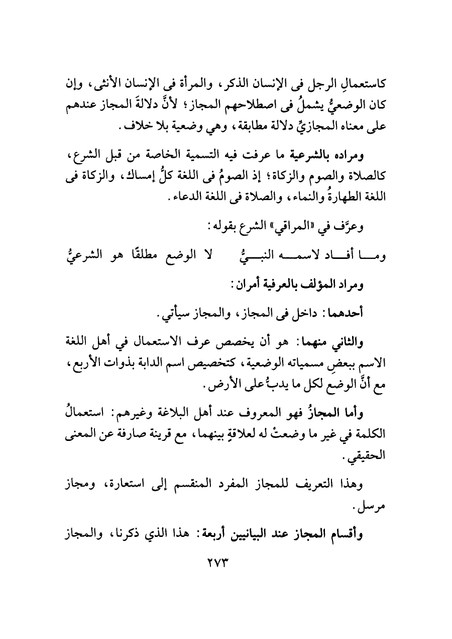 ومراده بالشرعية ما عرفت فيه التسمية الخاصة من قبل الشرع، كالصلاة والصوم والزكاة؛ إذ الصومُ فى اللغة كلُّ إمساك، والزكاة فى اللغة الطهارةُ والنماء، والصلاة فى اللغة الدعاء.