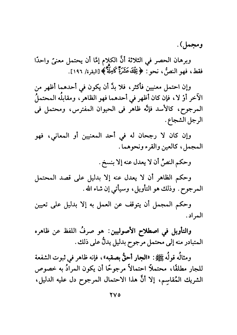 وبرهان الحصر في الثلاثة أنَّ الكلام إمَّا أن يحتمل معنًى واحدًا فقط، فهو النصُّ، نحو: {تِلْكَ عَشَرَةٌ كَامِلَةٌ} [البقرة/ ١٩٦].