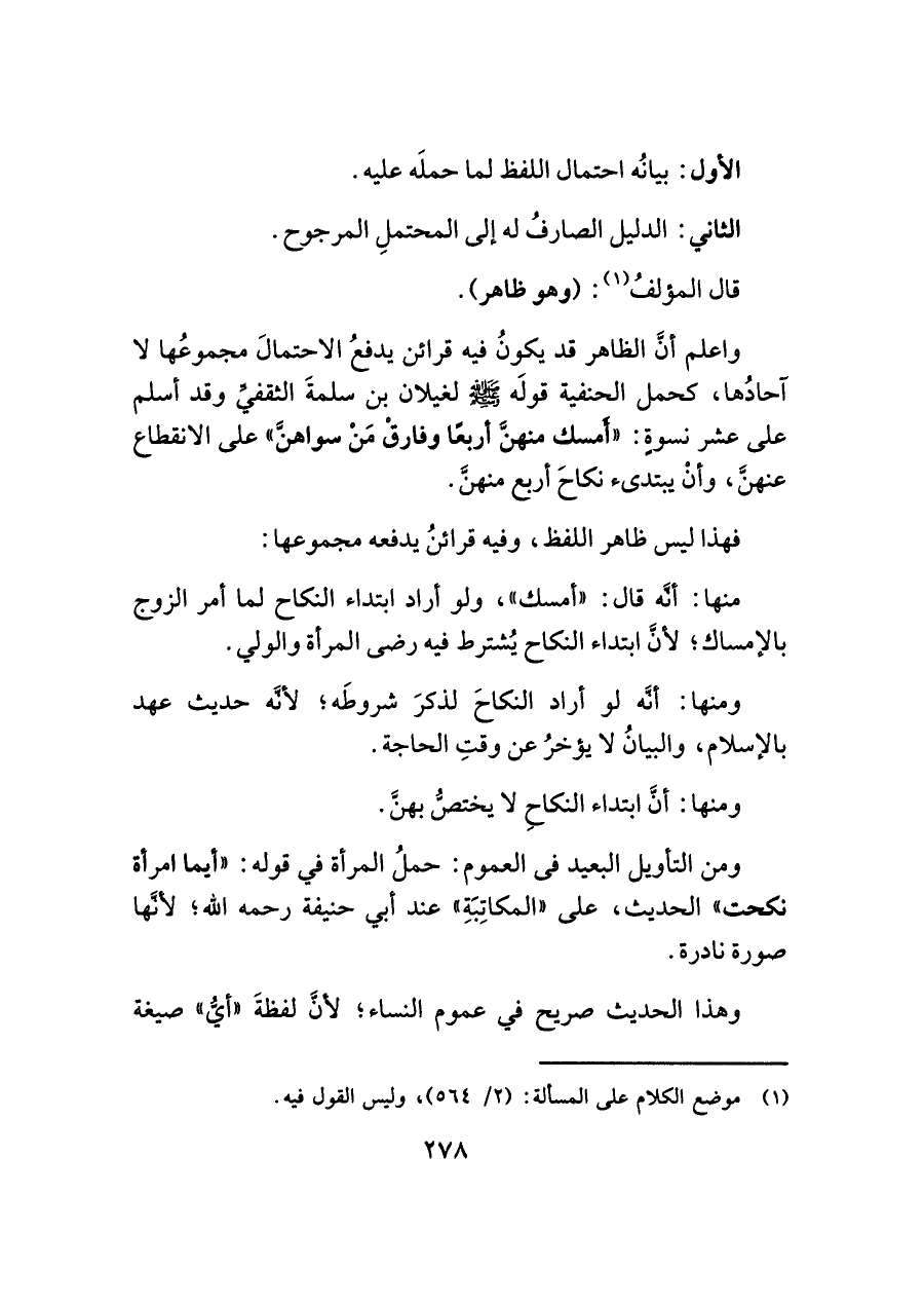واعلم أنَّ الظاهر قد يكونُ فيه قرائن يدفعُ الاحتمالَ مجموعُها لا آحادُها، كحمل الحنفية قولَه -صلى اللَّه عليه وسلم- لغيلان بن سلمةَ الثقفيِّ وقد أسلم على عشر نسوةٍ: "أَمسك منهنَّ أربعًا وفارقْ مَنْ سواهنَّ" على الانقطاع عنهنَّ، وأنْ يبتدئ نكاحَ أربع منهنَّ.