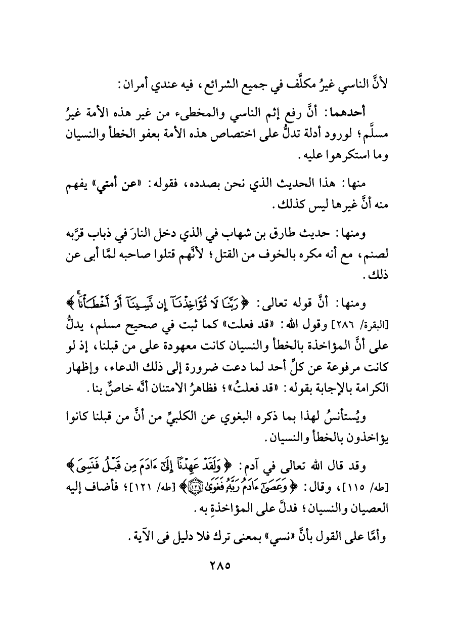 وقد قال اللَّه تعالى في آدم: {وَلَقَدْ عَهِدْنَا إِلَى آدَمَ مِنْ قَبْلُ فَنَسِيَ} [طه/ ١١٥]، وقال: {وَعَصَى آدَمُ رَبَّهُ فَغَوَى (١٢١)} [طه/ ١٢١]؛ فأضاف إليه العصيان والنسيان؛ فدلَّ على المؤاخذةِ به.