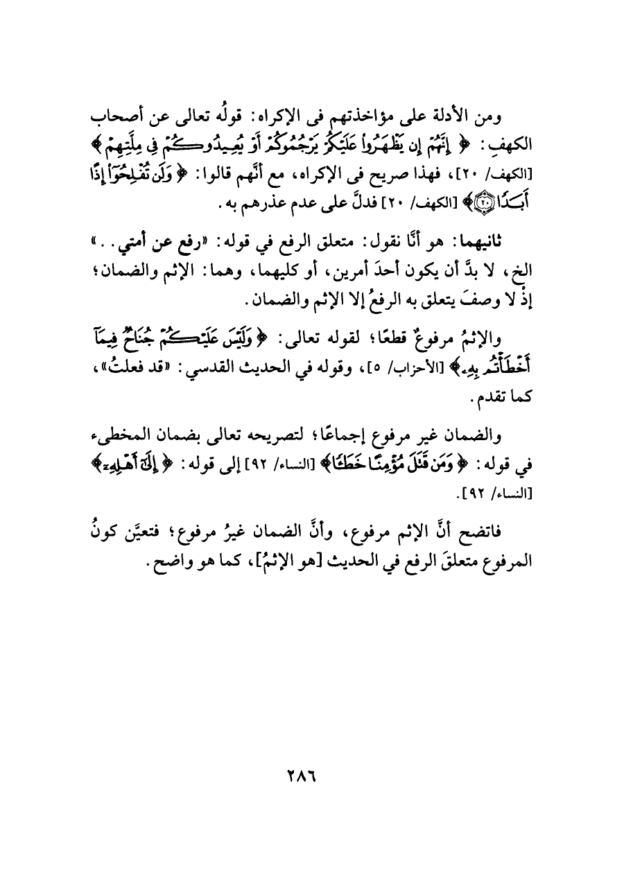 ثانيهما: هو أنَّا نقول: متعلق الرفع في قوله: "رفع عن أمتي. . " الخ، لا بدَّ أن يكون أحدَ أمرين، أو كليهما، وهما: الإثم والضمان؛ إذْ لا وصفَ يتعلق به الرفعُ إلا الإثم والضمان.