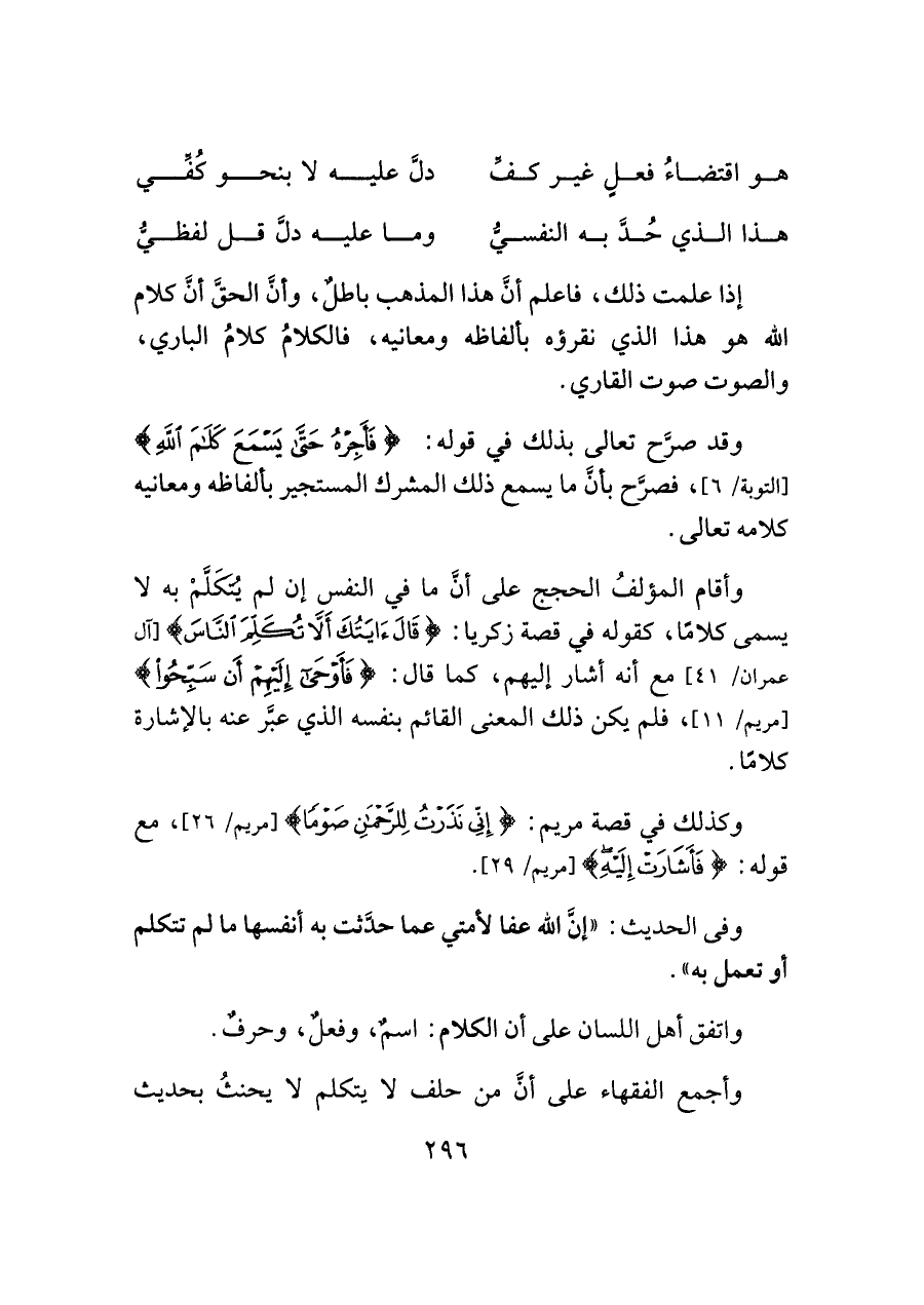 وأقام المؤلفُ الحجج على أنَّ ما في النفس إن لم يُتَكَلَّمْ به لا يسمى كلامًا، كقوله في قصة زكريا: {قَالَ آيَتُكَ أَلَّا تُكَلِّمَ النَّاسَ} [آل عمران/ ٤١] مع أنه أشار إليهم، كما قال: {فَأَوْحَى إِلَيْهِمْ أَنْ سَبِّحُوا} [مريم/ ١١] فلم يكن ذلك المعنى القائم بنفسه الذي عبَّر عنه بالإشارة كلامًا.